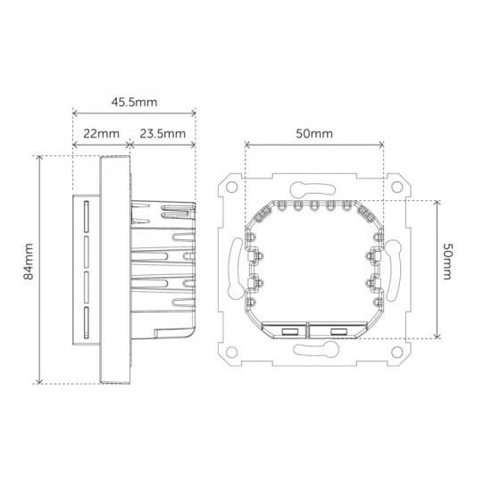 Méretek: 87 x 87 x 45 mm (szabványos fali szerelvénydobozba illeszkedik)